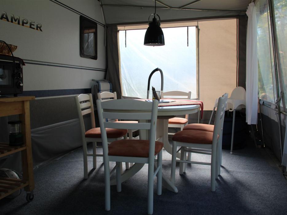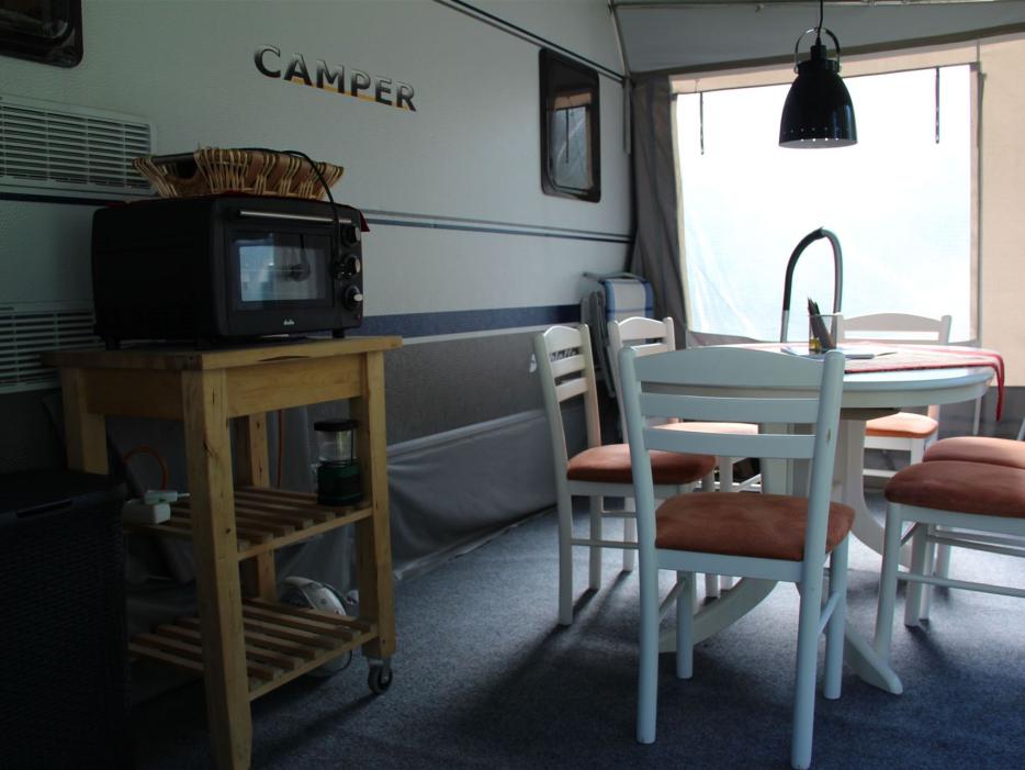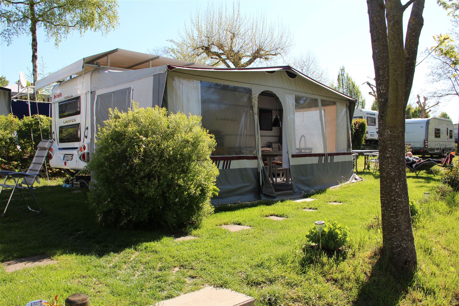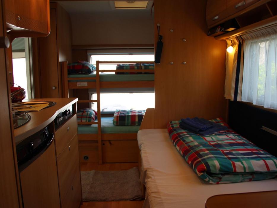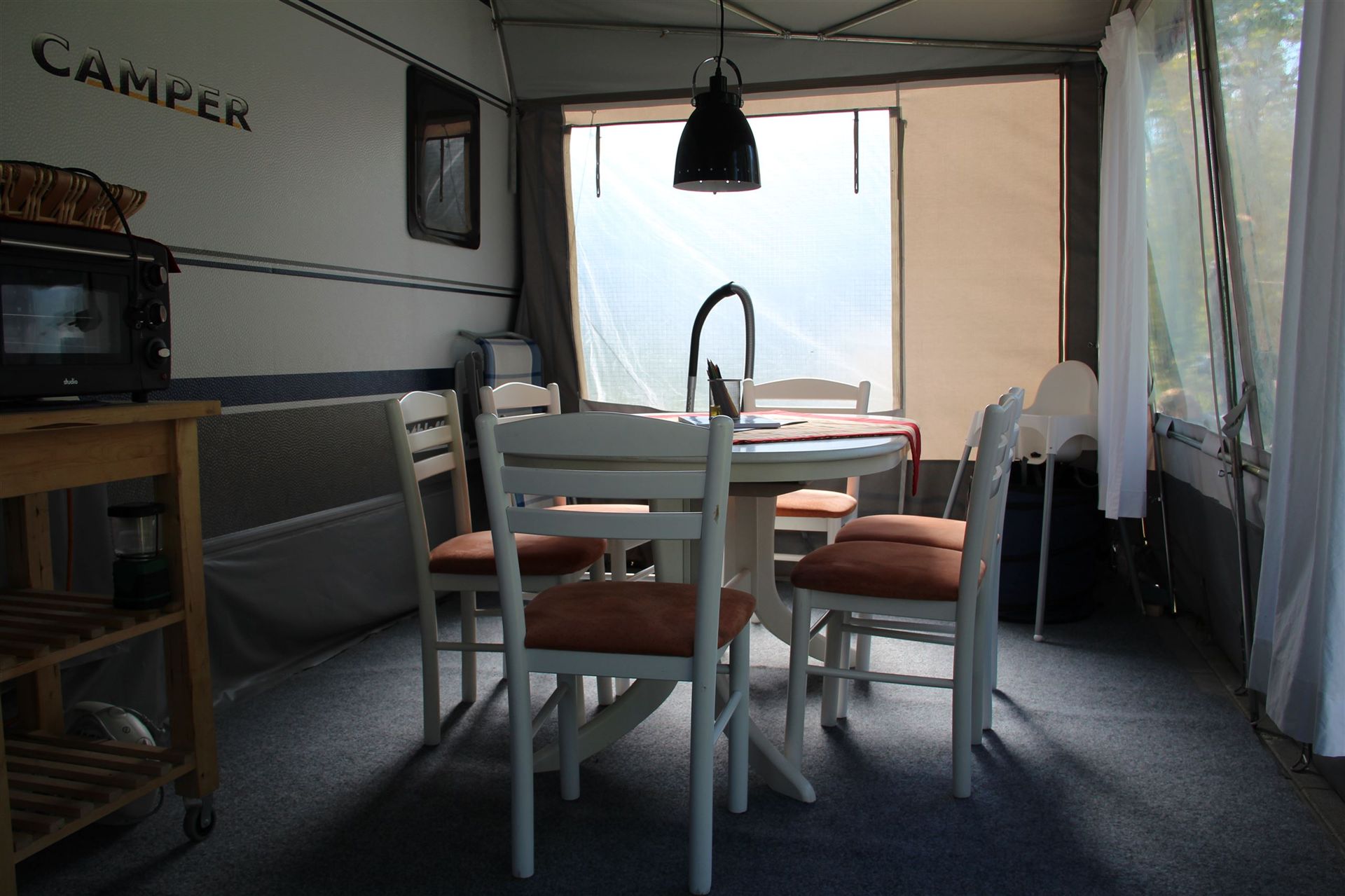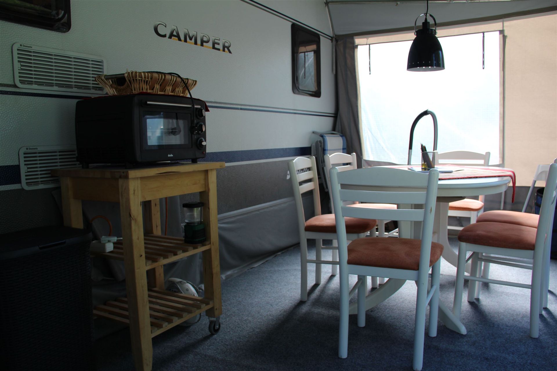 Der Mietwohnwagen "Dethleffs Camper 540SK" auf Platz 109 bietet Platz für 5 Personen ( 2x im Doppelbett, 2x Kinder in Stockbetten 1x auf der umgebauten Sitzecke). Vor dem Wagen befindet sich ein Vorzelt, das genug Platz für Küchenzeile, Abstellmöglichkeiten, Sitzgruppe und Ähnliches bietet.