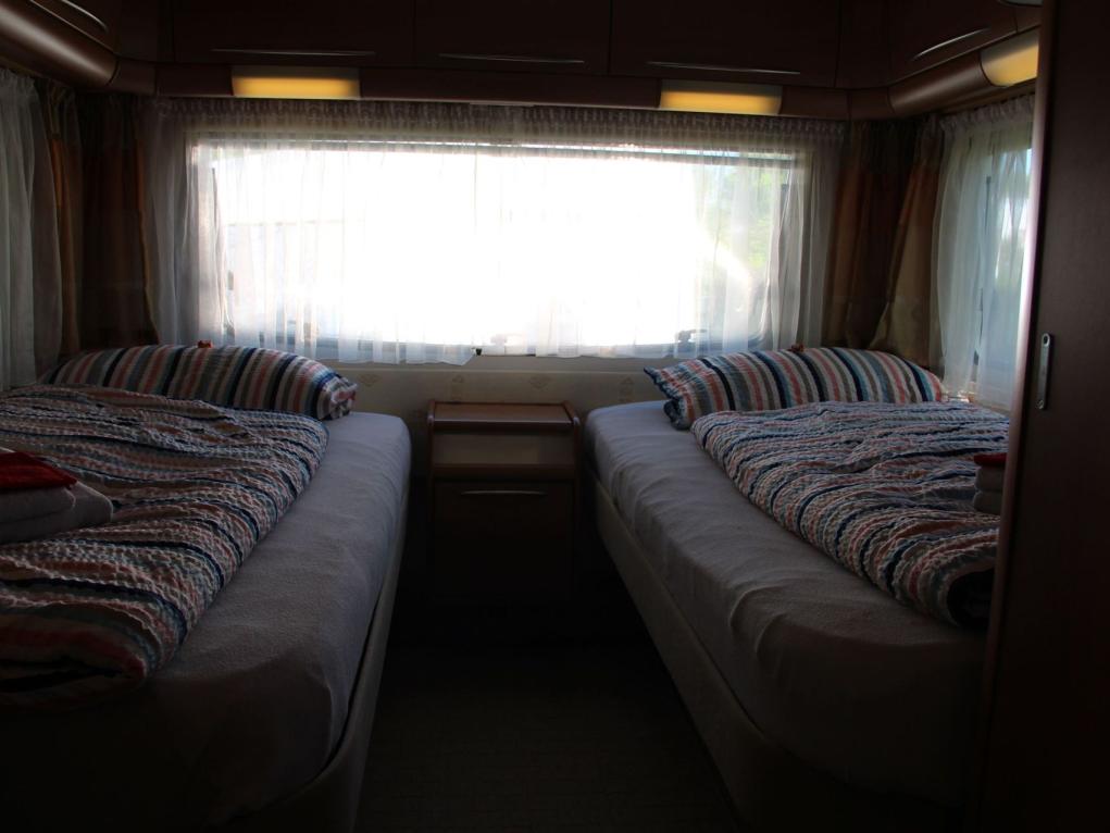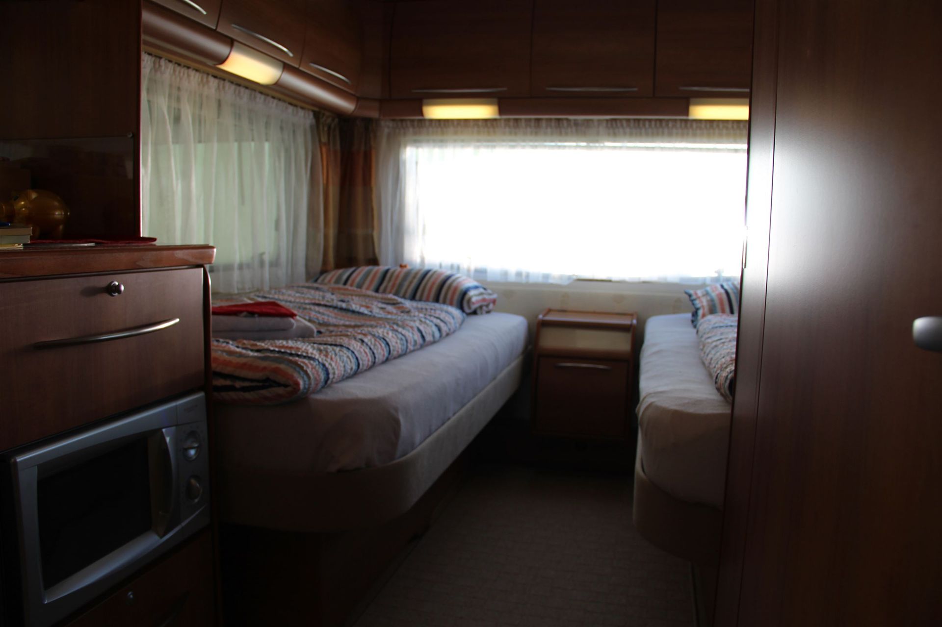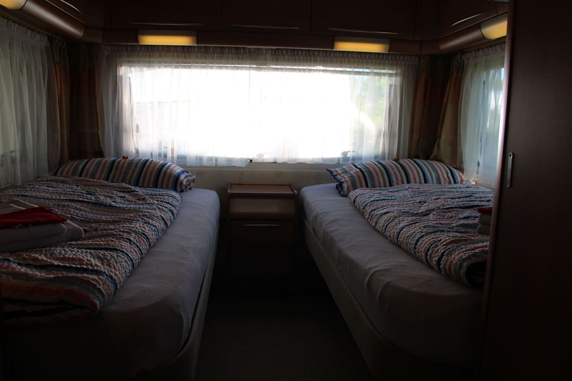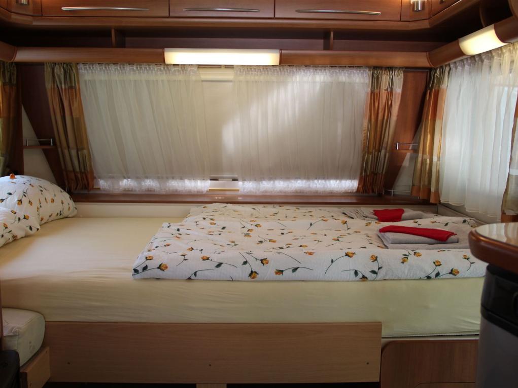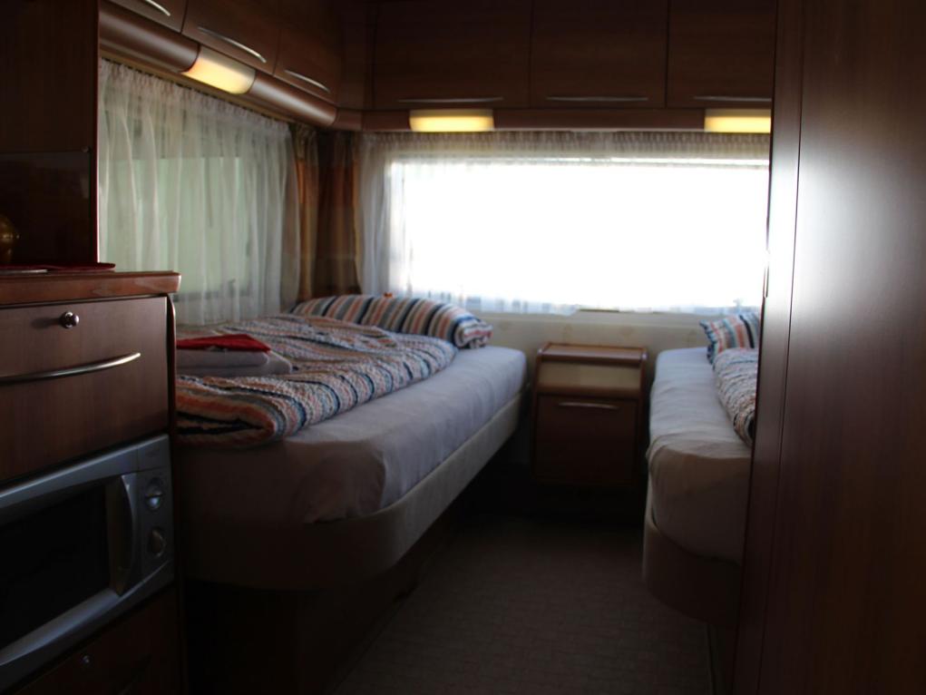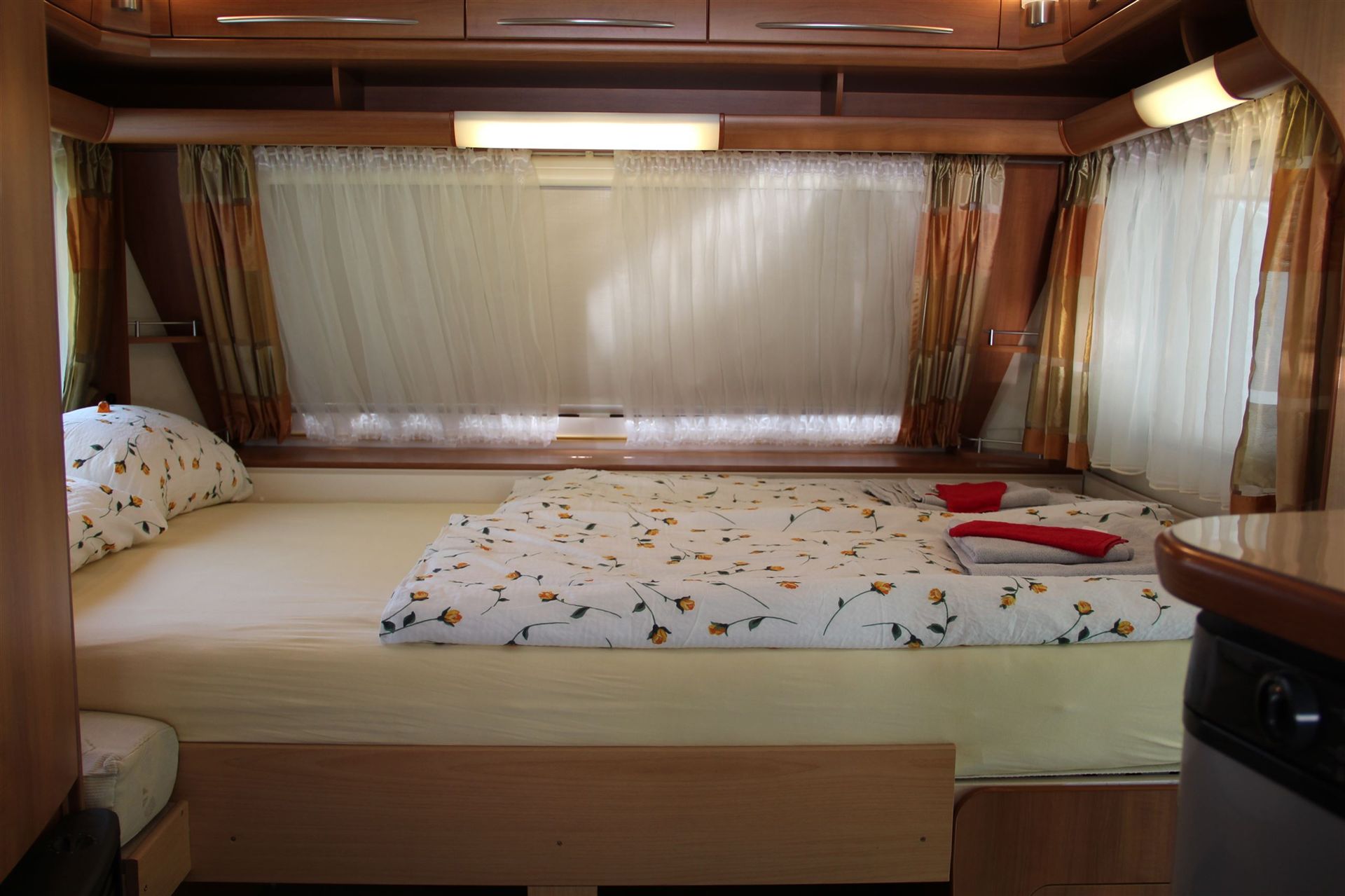 Im Wohnwagen ist keine Sitzgruppe vorhanden, diese musste dem großen Doppelbett weichen.