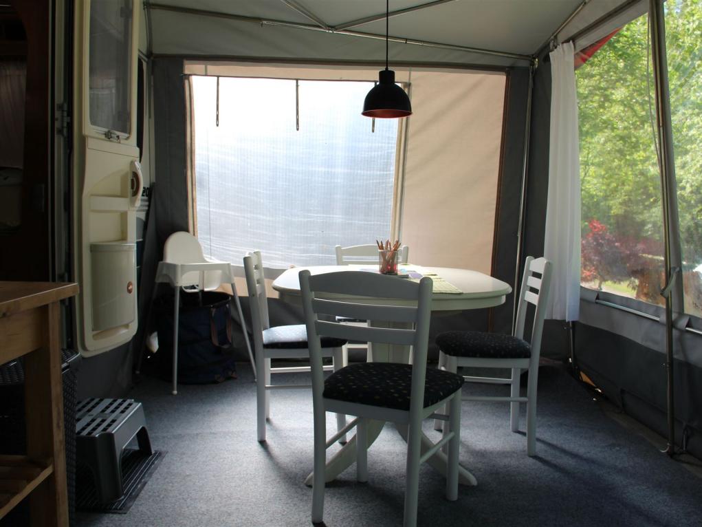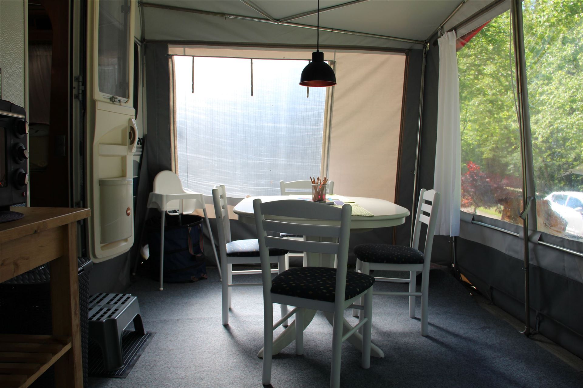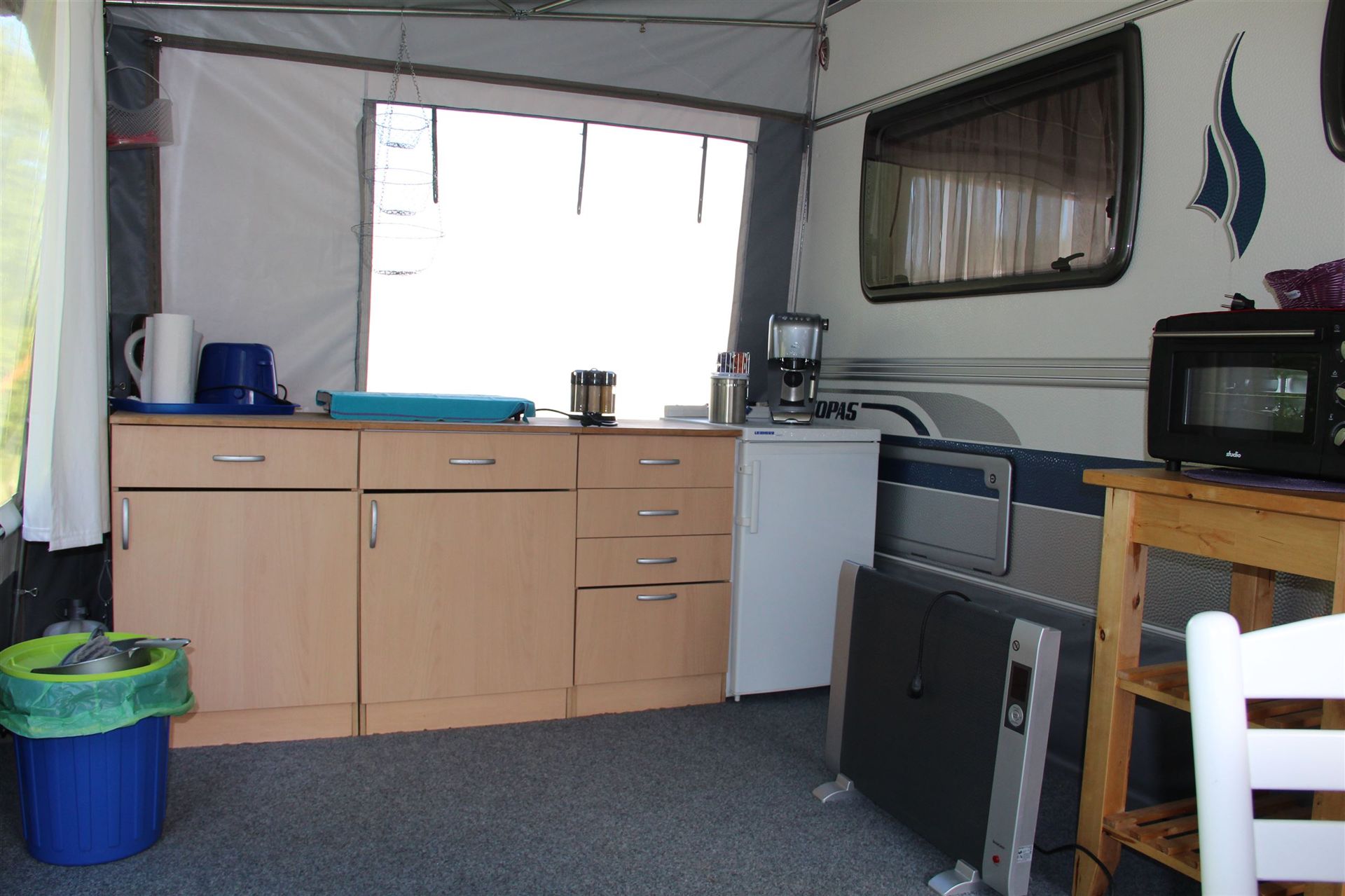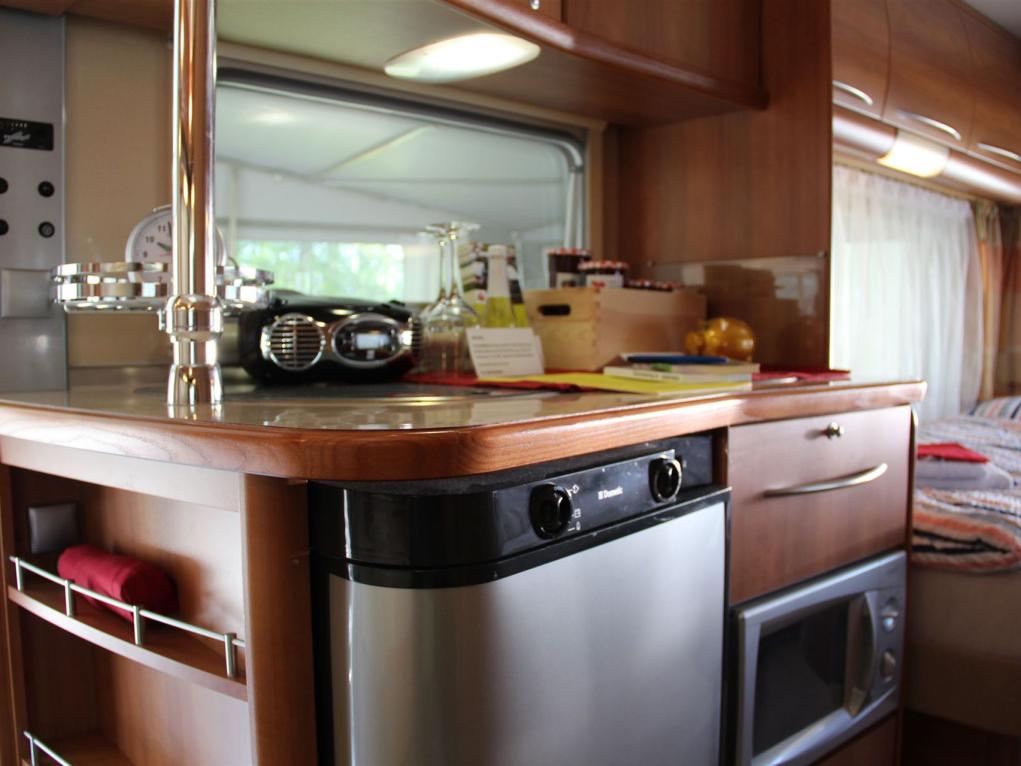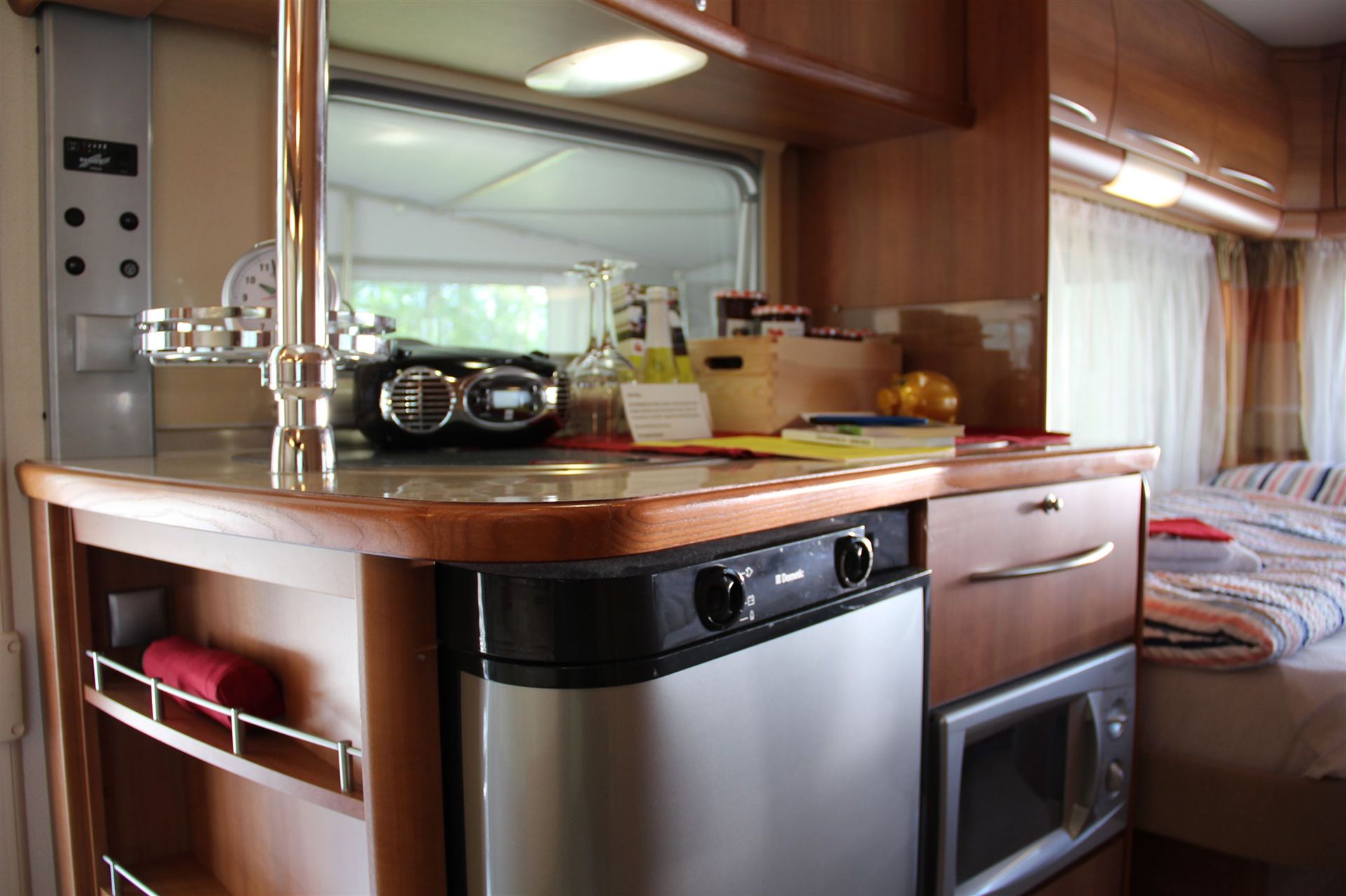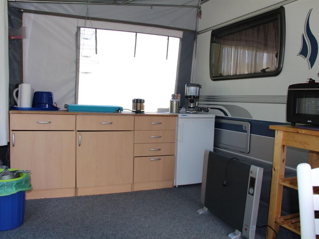 Im Wohnwagen ist keine Sitzgruppe vorhanden, diese musste dem großen Doppelbett weichen.